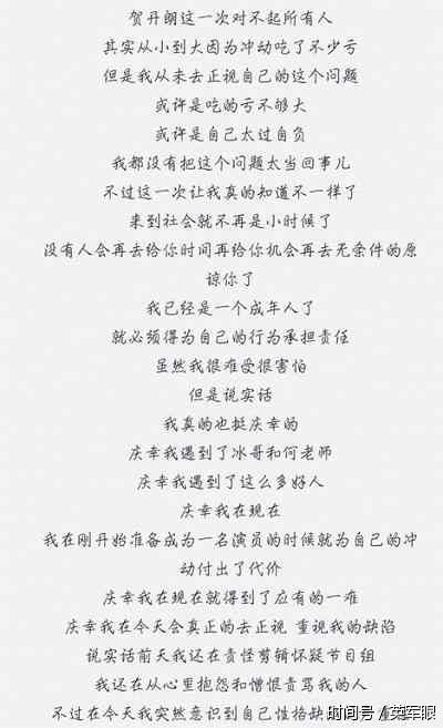6月30日中午,当事人贺开朗在微博发长文道歉,他写道:“来到社会上,就不是小时候,没有人会再去给你时间再给你机会再去无条件的原谅你了。”“虽然我很难受很害怕,但真的挺庆幸的。”贺开朗直言,自己不会做任何的解释和反驳,也不奢求大家原谅,但会竭尽全力改变。