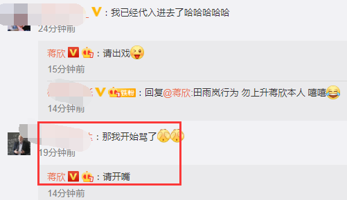 一个网友调皮地说:那我开始骂了。蒋欣淡定回复:请开嘴。哈哈,蒋欣喊话网友张开嘴去骂。